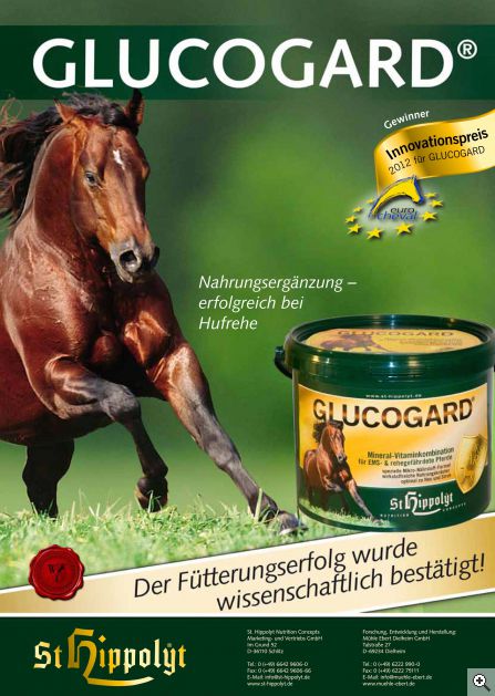 Bei der diesjährigen Eurocheval-Pferdemesse in Offenburg wurde der Innovationspreis für Ergänzungsfuttermittel an die Firma St. Hippolyt verliehen. Der hochkarätigen Jury gehörten unter anderem Landoberstallmeisterin Dr. Astrid von Velsen-Zerweck, Prof. Dr. Dirk Winter von der Hochschule Nürtingen, der Stuttgarter Verleger Hugo Matthaes und der Tierarzt Dr. Peter Witzmann an. Mit dem Innovationspreis wurde das Spezial-Zusatzfutter St. Hippolyt Glucogard® ausgezeichnet, das für rehegefährdete Pferde entwickelt wurde. Mitglieder der Jury hoben hervor, dass vor allem der wissenschaftliche Nachweis der gesundheitsfördernden Eigenschaften von Glucogard® den Ausschlag zur Preisverleihung gab. Damit wurde die jahrelange Forschungs- und Entwicklungsarbeit anerkannt, die in der Mühle Ebert Dielheim in Zusammenarbeit mit der Life Science-Universität Breslau zur Entstehung von Glucogard® geführt hatte. Glucogard® kann über ernährungsphysiologische Effekte zum Abbau von Risikofaktoren für die Hufrehe beitragen. Dazu gehören die Funktionsschwäche des „Zuckerhormons“ Insulin, der überhöhte Insulinspiegel im Blut, das Übergewicht und die Bildung hormonell aktiver Fettgewebe. Wissenschaftliche Untersuchungen weisen darauf hin, dass durch die Entschärfung solcher Risikofaktoren vielen Pferden das Fiasko einer Hufrehe erspart bleiben kann. Ausführliche Informationen zur Glucogard®-Forschung gibt die Broschüre „Equigard® und Glucogard® – ein Beitrag gegen die Hufrehe?“ Diese Dokumentation ist bei St. Hippolyt (Tel. 06642 9606-0) und beim St. Hippolyt-Futtermittelhandel kostenfrei erhältlich. Hier gehts zum ausgezeichneten Produkt. |