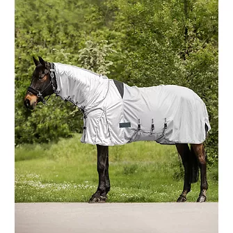 Multifunktionale PROTECT Ekzemer-Fliegendecke von Waldhausen mit elastischem Halsteil, feinmaschigem Insektenschutz, Bauch- & Schweiflatz sowie sicherer Doppel-Frontverschluss-Konstruktion für guten Sitz.