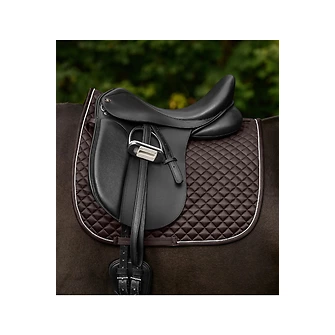 Elegante Dressurschabracke in Shiny-Optik mit glänzender Kordel, atmungsaktivem Material und 15 mm druckausgleichendem Schaum für Komfort und Funktion. Optimal für Training & Alltag.