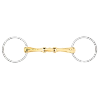 Die Waldhausen Wassertrense mit doppelt gebrochenem Mundstück aus Cyprium unterstützt eine feine und gleichmäßige Zügelwirkung. Die frei beweglichen Ringe sorgen für eine flexible Einwirkung und fördern eine präzise Kommunikation zwischen Reiter und Pferd. Durch die Cyprium-Legierung mit erhöhtem Kupferanteil kann die Speichelbildung angeregt und die Kautätigkeit des Pferdes unterstützt werden, was die Akzeptanz des Gebisses verbessert.
