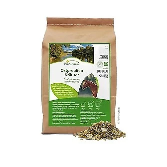 Für Pferde, die sehr eiweiß- und fruktanreich gefüttert werden oder häufig an Hufrehe, Durchfall oder Koliken neigen, ist diese Kräutermischung unentbehrlich. Die enthaltenen verdauungsfördernden Bitterkräuter unterstützen den Fruktanabbau und regenerieren so die Darmflora. Besonders ein aufgeblähter Pferdebauch zeigt, dass die Darmflora gestört ist. Bei Pferden, die sich nach rechts schlecht biegen, liegt das häufig am gestörten bzw. gereizten Blinddarm. Dort lassen sie sich auch nur ungern anfassen und putzen. Ostpreußen-Kräuter bieten die richtige Hilfe. Die bitterwürzigen Kräuter fördern die Darmflora und helfen, energie- und eiweißreiches Gras und Heu besser zu verdauen. Sie fördern die Sekretion der Verdauungssäfte und regen die Bauchspeicheldrüse an. Dadurch kann sich die Darmflora erneuern, der Blinddarm wird entlastet.