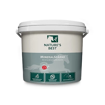 Die MineralStärke von Natures Best liefert eine natürliche Mineralversorgung ohne die Entgiftungsorgane zusätzlich zu belasten. Mit der getreide- und melassefreien Rezeptur eignet es sich besonders für Pferde mit Stoffwechselproblemen. Die Natures Best MineralStärke kann den natürlichen Bedarf deines Pferdes an Spurenelementen & Vitaminen, Kräutern und Gesteinspartikeln durch die natürlichen Komponenten nachahmen. Gesteinsmehle wie Dolomit, Kalkstein, Steinsalz und Algenkalk liefern verschiedene Spurenelemente wie Calcium und Magnesium, sowie die Elektrolyte Chlorid und Natrium. Neben Hagebutten sind Aroniabeeren ein wertvoller Vitamin C Lieferant. Petersilie, Karotte, Apfeltrester und Bierhefe sind für die weitere Vitaminversorgung deines Pferdes. Mit den Spurenelementen Magnesium, Mangan, Selen und Vitamin E wird der Muskelstoffwechsel deines Pferdes unterstützt. Zusätzlich sorgen Biotin, Zink und Schwefel für eine gesunde Haut und Hufwachstum.