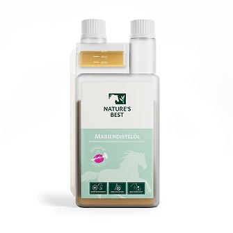 Zeigt dein Pferd Müdigkeit, Abmagerung, Schwäche oder Fellwechselstörungen bzw. Ekzeme? Dann kann es sein, dass die Leber eine Extraportion an Nährstoffen benötigt. Das Mariendistelöl von Natures Best ist reich an Silymarin und wertvollen Ölsäuren der Mariendistel, die der Zerstörung von Zellmembranen entgegen wirken, die Eiweißsynthese fördern und die Zellregeneration beschleunigen. Silymarin dient vor allem dem Schutz und der Regeneration der Leberzellen, es ist somit ratsam, die Leber in Zeiten besonderer Beanspruchung damit zu unterstützen. Die Kraftfutterration deines Pferdes kann mit Natures Best Mariendistelöl einfach energetisch aufgewertet werden.