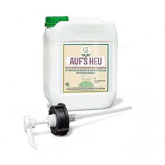 Eine echte Alternative zu Heu Waschen oder Heu Bewässern! Der AUF's HEU Heuoptimierer mit wertvollem Oregano Öl bindet Staub, reduziert Keime und Schimmelpilze und verbessert die Schmackhaftigkeit des Raufutters.